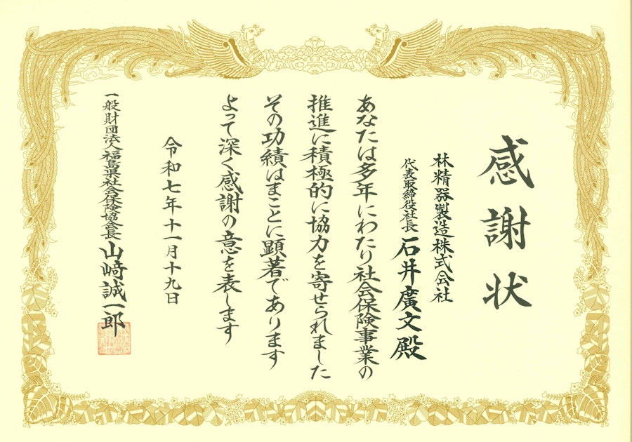 2025年11月19日に林精器が、一般財団法人福島県社会保険協会長感謝状を優良事業主として表彰を受けました。